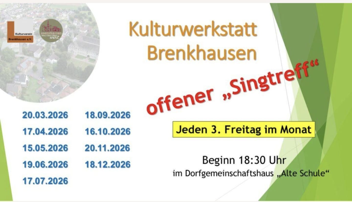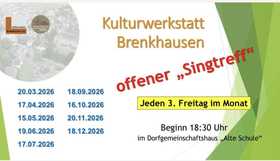 Der Kulturverein und die Kulturwerkstatt laden herzlich zum "offenen Singtreff" ein. Jeden 3. Freitag im Monat von 18:30 Uhr - 19:30 Uhr im Dorfgemeinschaftshaus "Alte Schule".